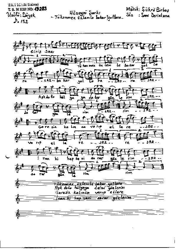 Şükrü Birbaş, bir beste denemesini de Sözleri Sami Derntuna’ın yazdığı Hüseyni bestesi: