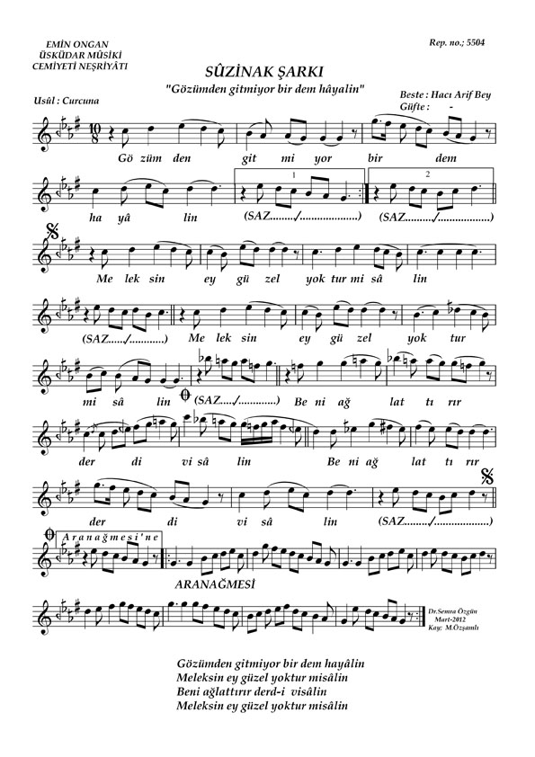 Daha önceden de yediği bir darbeye birde Zülf-i Nigar Hanım’dan ayrılması bir hicran yarası oldu onun için. Zülf-i Nigar Hanım ile çok mutluydu. Ölümüne inanamıyordu. Onu unutamıyor ve her gün ağlıyordu. Bu duyguları ile yeniden kâğıda kaleme sarılıyor ve Suzinak Makamında;