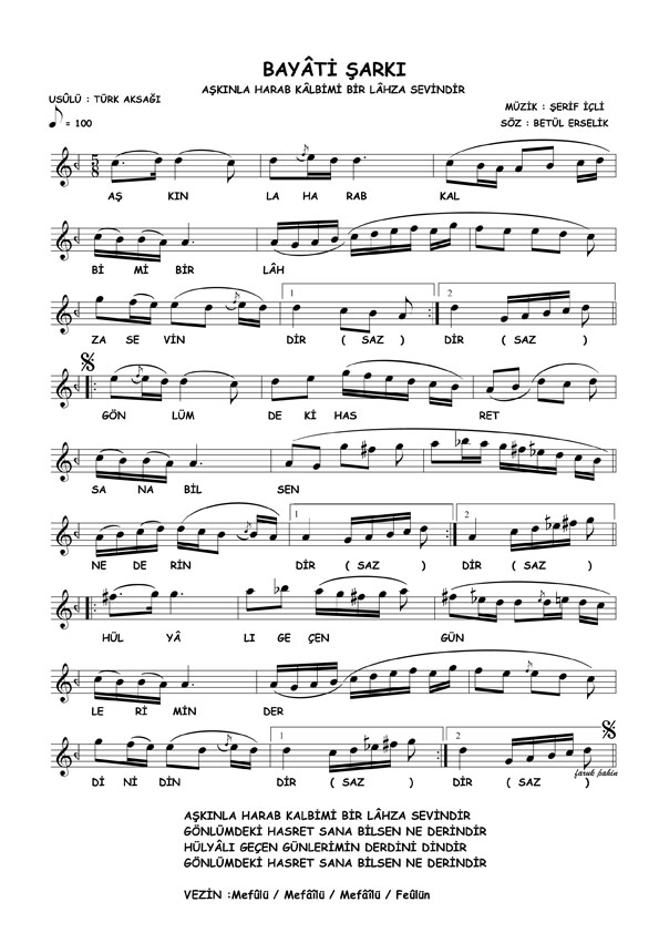 Aşkınla harap kalbimi bir lahza sevindir - Notası - Sözleri